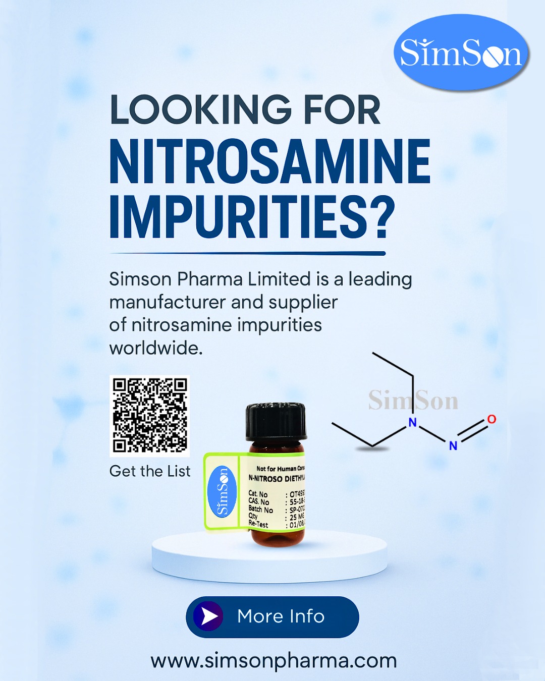 Simson Pharma is a leading global manufacturer and supplier of certified Nitrosamine impurity standards like NDMA, NDEA, NMBA, and more for pharma compliance.
